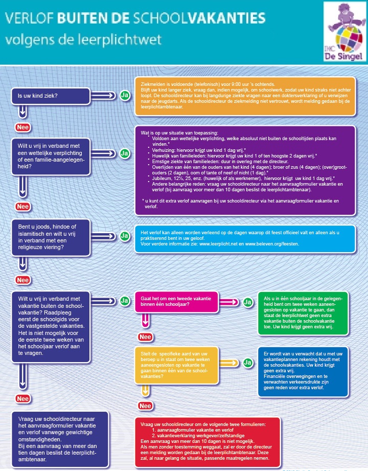 Scholen zijn verplicht ongeoorloofd schoolverzuim te melden bij de leerplichtambtenaar. Soms kan een leerling niet naar school en is er sprake van geoorloofd schoolverzuim. De website van Leerrecht (www.leerrecht.nl) geeft ouders en scholen praktische informatie en antwoorden op vragen over zaken als leerplicht, verlofregelingen en vrijstellingen. Is het niet mogelijk om tijdens de schoolvakanties op vakantie te gaan? Dan kunt u in zeer uitzonderlijke gevallen bij de schoolleiding toestemming voor verlof buiten de schoolvakanties aanvragen.